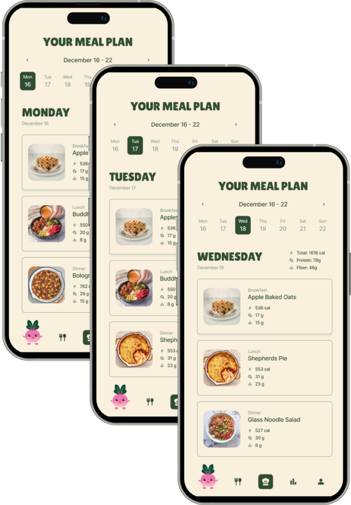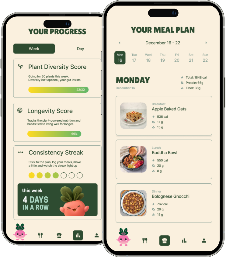 Personalised plant-based meal plans, easy recipes, and habit-building rewards — designed for real life.